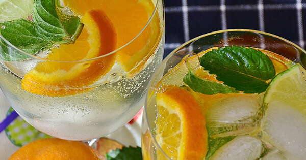 Mineralwasser mit frischer Zitrone / Orange und einem Blatt Minze ist als erfrischendes Getränk bei Gicht erlaubt